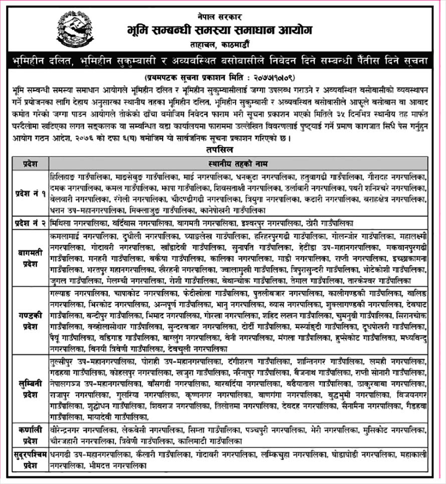आयोगले शुक्रबार सूचना जारी गर्दै भूमिहीन दलित, सुकुम्बासी र अव्यवस्थित बसोबासीलाई आफू बसोबास गरिरहेको वा आवाद गरेको जग्गा प्राप्तिका लागि ३५ दिनभित्र स्थानीय तहमा निवेदन बुझाउन भनेको छ।