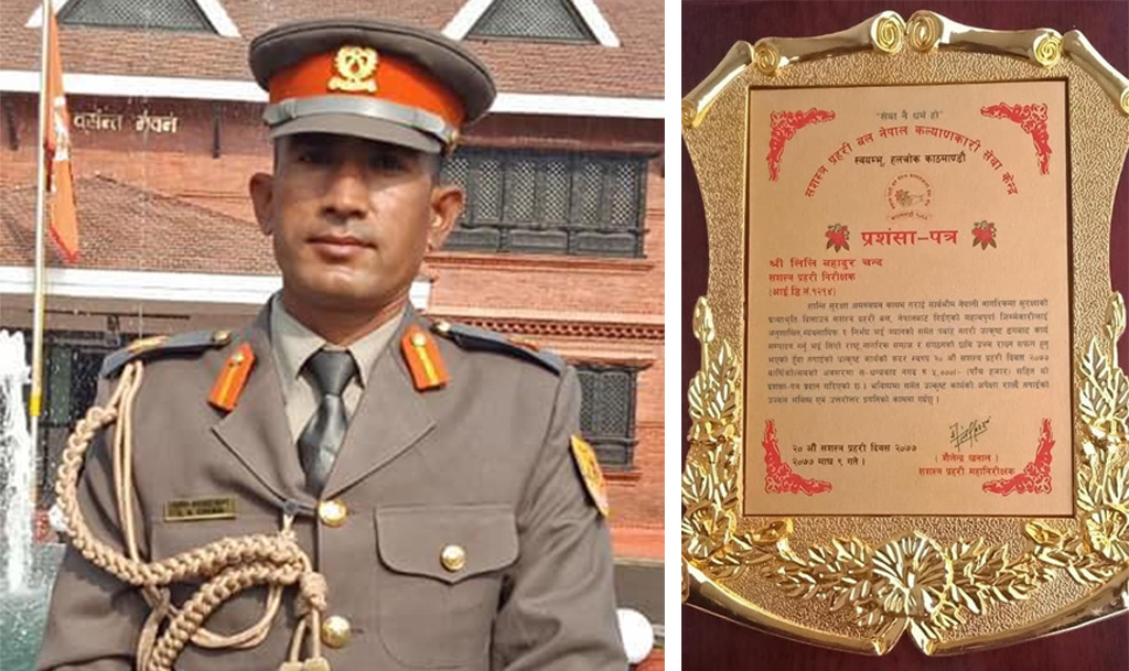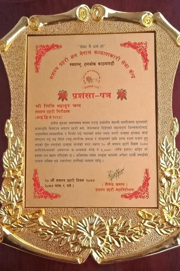 काठमाडौं – सशस्त्र प्रहरीका प्रहरी निरीक्षक लिलिबहादुर चन्द सशस्त्र प्रहरी बलबाट सम्मानित भएका छन् ।