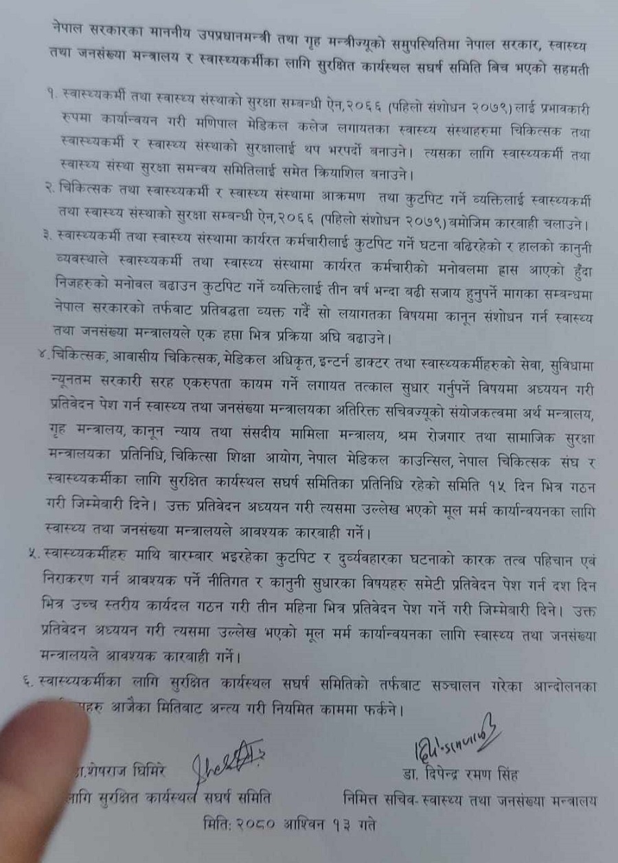 सहमतिपत्रमा स्वास्थ्य तथा जनसङ्ख्या मन्त्रालयका निमित्त सचिव डा दिपेन्द्ररमण श्रेष्ठ र “स्वास्थकर्मीका लागि सुरक्षित कार्यस्थल संघर्ष समिति” का संयोजक डा शेषराज घिमिरेले हस्ताक्षर गरेका छन् ।