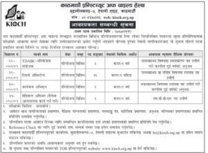 काठमाडौं- काठमाडौं इन्स्टिच्युट अफ चाइल्ड हेल्थ (किओच)ले विभिन्न पदमा २० जना कर्मचारीका लागि दरखास्त आह्वान गरेको छ।