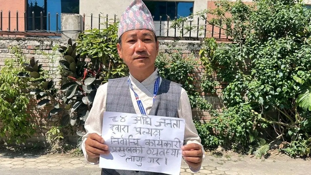 धरानका विकास निर्माण योजनासहित मन्त्री र प्रधानमन्त्रीलाई भेट्न काठमाडौँ आएका मेयर सम्पाङले मंगलबार बिहान एकल प्रदर्शन गरेका हुन् । उनले ‘०८४ अघि जनताद्वारा प्रत्यक्ष निर्वाचित कार्यकारी प्रमुखको व्यवस्था लागू गर’ लेखिएको प्लेकार्ड बोकेका थिए ।