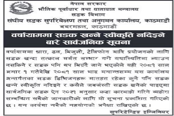 असार १ गतेदेखि भदौ मसान्तसम्म सडक खन्न नपाइने