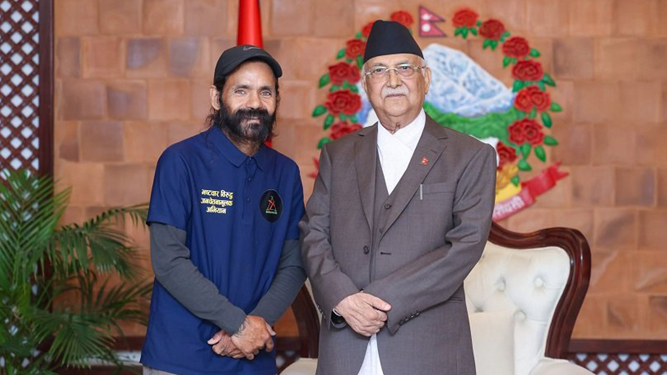 काठमाडौं — कर्णालीका सामाजिक अभियन्ता नवराज बोहराले आइतबार प्रधानमन्त्री केपी शर्मा ओलीसँग भेट गरेका छन्। सुर्खेतबाट खाली खुट्टा हिँड्दै कर्णालीको सुशासन, विकास, वातावरणीय सन्तुलन र पशु संरक्षण जस्ता विषयमा जनचेतना फैलाउने उद्देश्यले यात्रा सुरु गरेका बोहरा ३१ दिनको यात्रापछि असार ३ गते काठमाडौं आइपुगेका थिए।