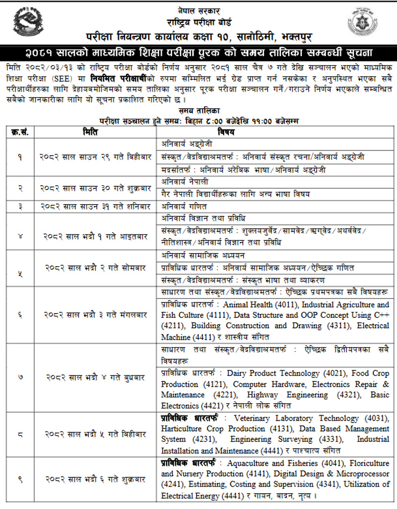 यस्तो छ एसईई पुरक परिक्षाको रुटिङ (तालिकासहित)