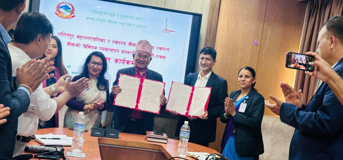 ललितपुर महानगर र राष्ट्रिय बिमा बोर्डबीच बुधबार प्रिमियम तिर्ने सम्बन्धी समझदारी पत्रमा महानगर प्रमुख चिरीबाबु महर्जन र बिमा बोर्डका कार्यकारी निर्देशक रघुराज काफ्लेले संयुक्त रुपमा हस्ताक्षर गरे । यसैगरी नगर प्रहरी, महानगरका सरसफाईकर्मी, सवारीचालक र महानगरमा बसोबास गर्ने एकल महिला र टोल स्वास्थ्य उत्पै्ररक (टिएचपी)को भने सय प्रतिशत नै प्रिमियम तिर्ने महानगरले जनाएको हो । कार्यक्रममा चेक हस्तान्तरण पनि गरिएको थियो ।