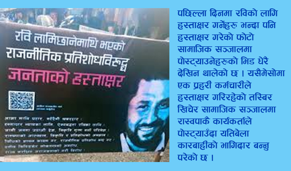 पछिल्ला दिनमा रविको लागि हस्ताक्षर गर्नेहरु भन्दा पनि हस्ताक्षर गरेको फोटो सामाजिक सञ्जालमा पोस्ट्याउनेहरुको भिड धेरै देखिन थालेको छ । यसैमेसोमा एक प्रहरी कर्मचारीले हस्ताक्षर गरिरहेको तस्बिर खिचेर सामाजिक सञ्जालमा रास्वपाकै कार्यकर्ताले पोस्ट्याउँदा यतिबेला कारबाहीको भागिदार बन्नु परेको छ ।