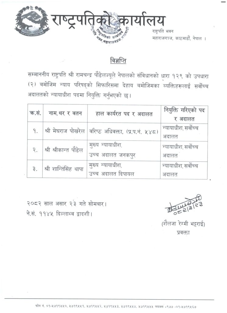 राष्ट्रपति पौडेलले सोमबार न्याय परिषद्को सिफारिसमा मेघराज पोखरेल, श्रीकान्त पौडेल र शान्तिसिंह थापालाई सर्वोच्चको न्यायाधीशमा नियुक्त गरेका हुन् ।
