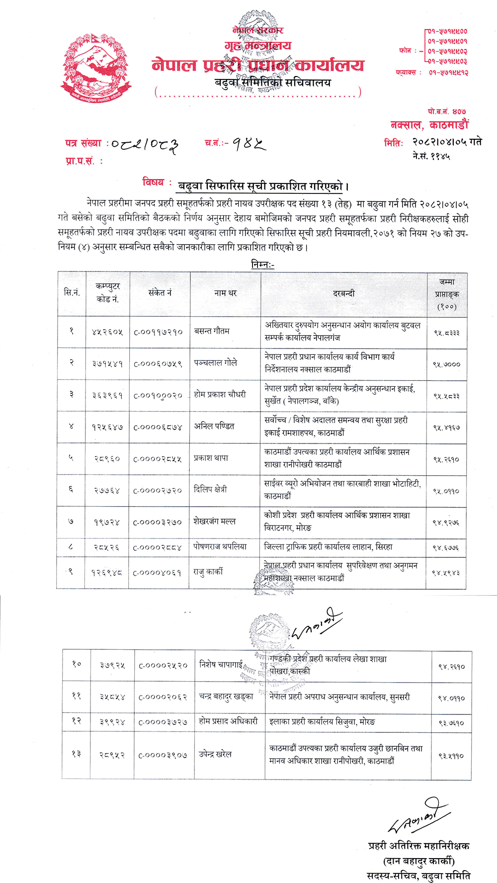प्रहरी मुख्यालयस्थित बढुवा समितिले योग्य ठहरिएका १३ जना इन्स्पेक्टरहरु बढुवा सिफारिस भएका हुन् ।