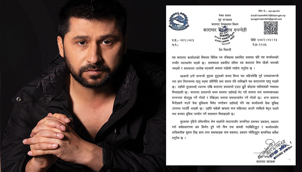 ‘सहकारी ठगी सम्बन्धी मुद्दामा थुनुवाको रूपमा विगत चार महिनादेखि पूर्व उपप्रधानमन्त्री तया हाल निलम्बनमा रहनुभएका प्रतिनिधि सभा सदस्य रवि लामिछाने यस कारागारमा रहनु भएको छ। उहाँको सुरक्षालाई ध्यानमा राखि कारागार प्रशासनले एउटा छुटै कोठामा बसोबासको व्यवस्था मिलाइएको छ’, उनले भनेका छन्, ‘कारागार प्रशासनले समय समयमा उहाँलाई भेट गरी समस्या तथा आवश्यकताका सम्बन्धमा सोधपुछ गर्ने गरेको र देखिएका समस्या समाधानसमेत गर्ने गरेको छ। अन्य सामान्य कैदीहरूले पाउने सेवा सुविधामा विभेद नगरीकन उहाँलाई पनि यस कार्यालयले सेवा सुविधा उपलब्ध गराउँदै आएको छ। उहाँले चाहेको खण्डमा मात्र बाहिरवाट आउने व्यक्तिले भेट्न पाउने तथा सञ्चार सुविधा उपयोग गर्ने वातावरण मिलाइएको छ।’
