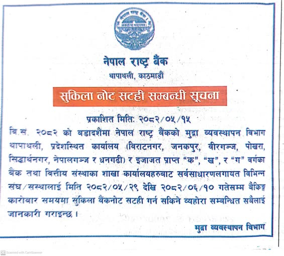 काठमाडौं – दसैँका लागि नेपाल राष्ट्र बैंकले यही भदौ २९ गतेदेखि असोज १० गतेसम्म सुकिला नोट सटही गर्ने भएको छ।