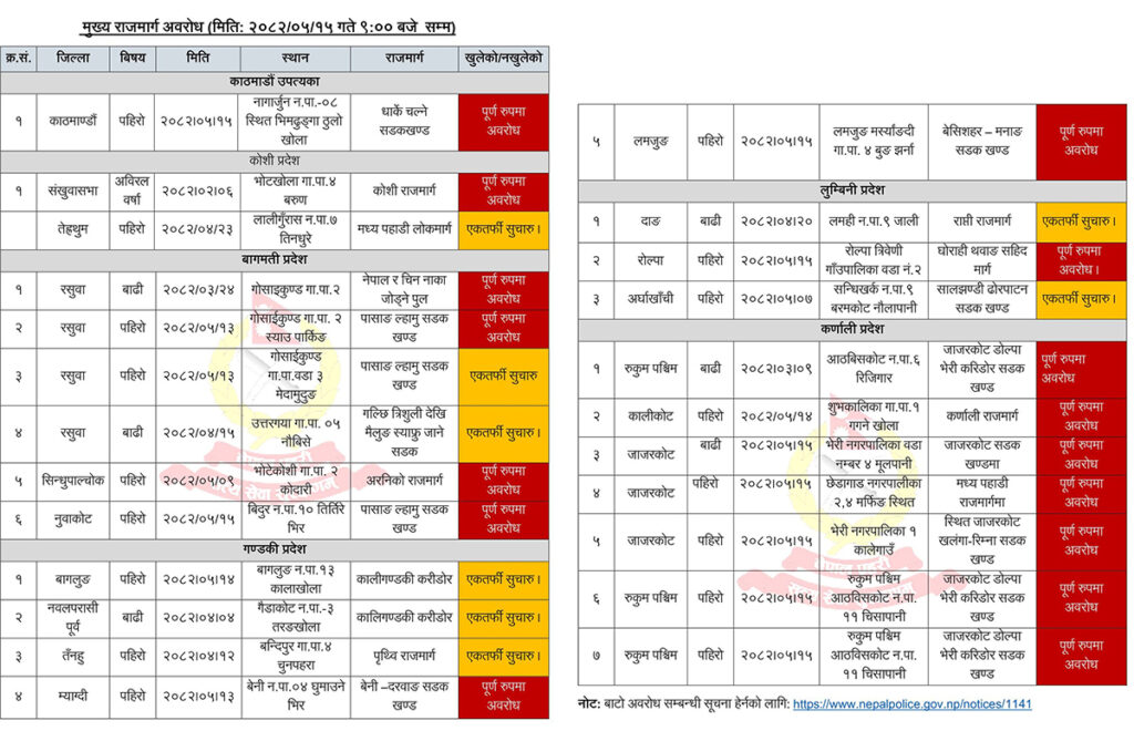 प्रहरीका अनुसार देशभरका १६ मुख्य राजमार्गहरु पूर्ण रुपमा अवरोध रहेका छन् भने ८ वटा राजमार्ग एकतर्फी सञ्चालन भइरहेको जनाएको छ ।