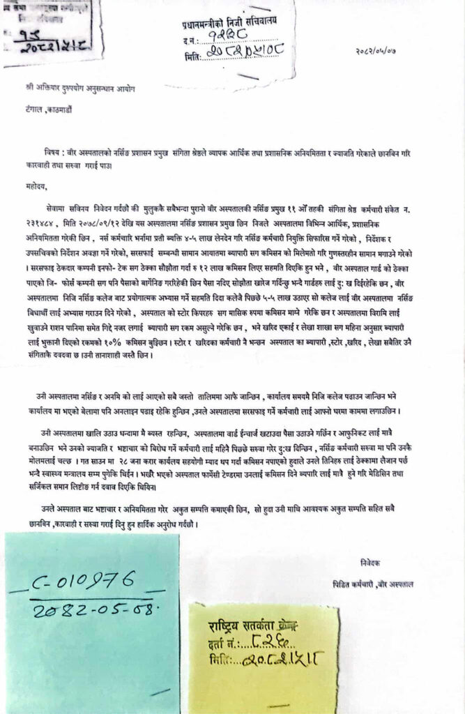 विभिन्न शाखामा कार्यरत केही भ्रष्ट कर्मचारीहरुले वीर अस्पतालमा हुने गरेका आपूर्ति, कर्मचारी भर्नालगायतका काममा भ्रष्टाचार गरेको र उनीहरु छानबिन र कारबाहीमा परेका समाचारहरु आइरहेका छन् । यसै सन्दर्भमा अस्पतालको नर्सिङ प्रमुख ११ औं तहकी संगीता श्रेष्ठमाथि पनि छानबिन र कारबाही गर्न प्रधानमन्त्री कार्यालय निर्देशन दिएको हो ।