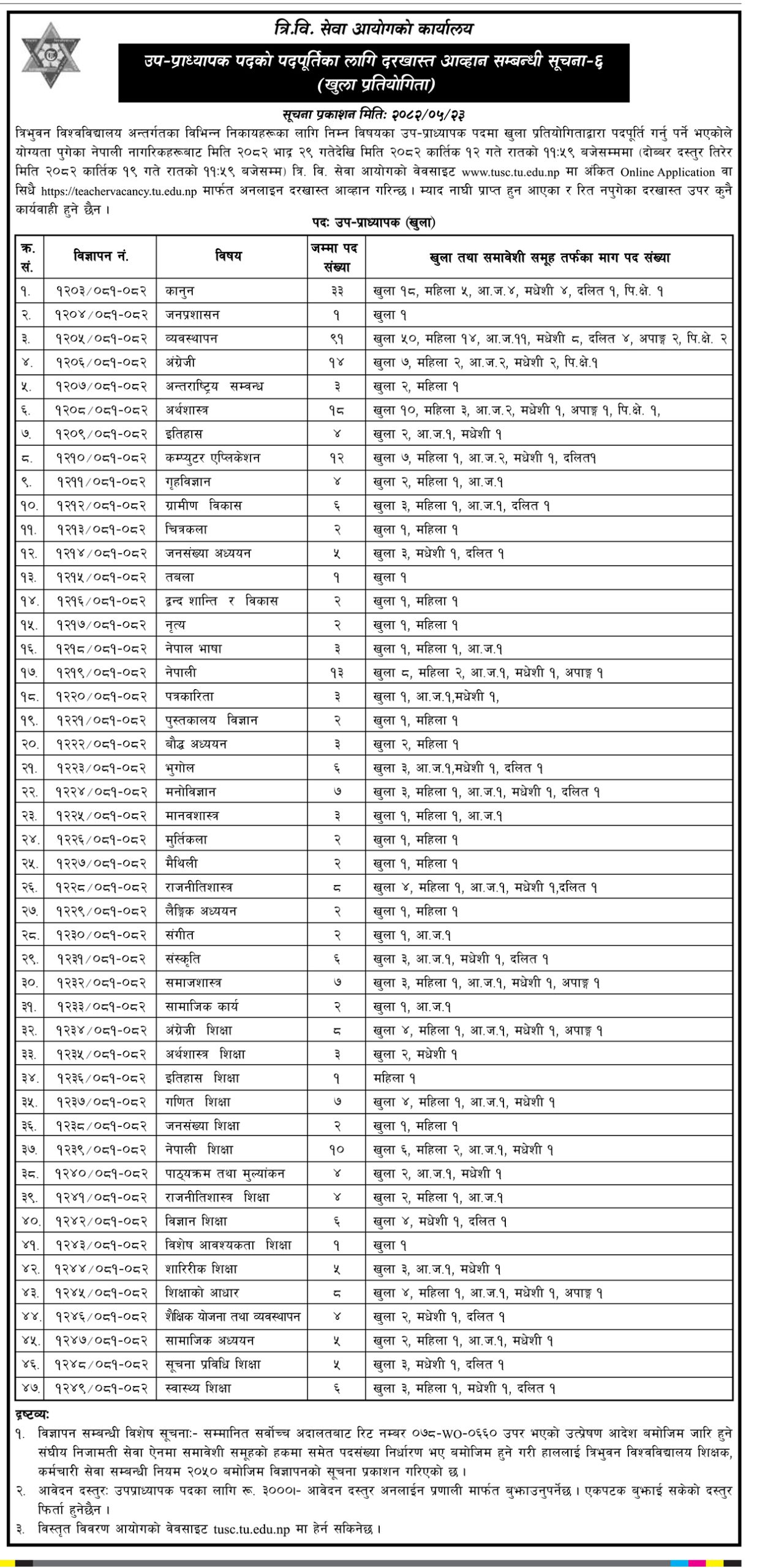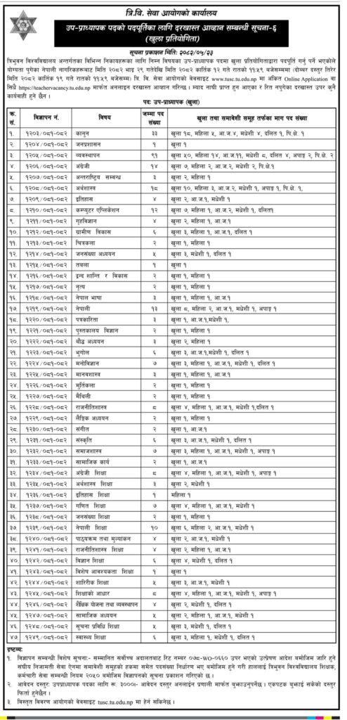 त्रिवि सेवा आयोगले खुला प्रतियोगिताबाट ४७ विषयमा उपप्राध्यापक पदपूर्ति गर्न आज दरखास्त आह्वान गरेको हो ।