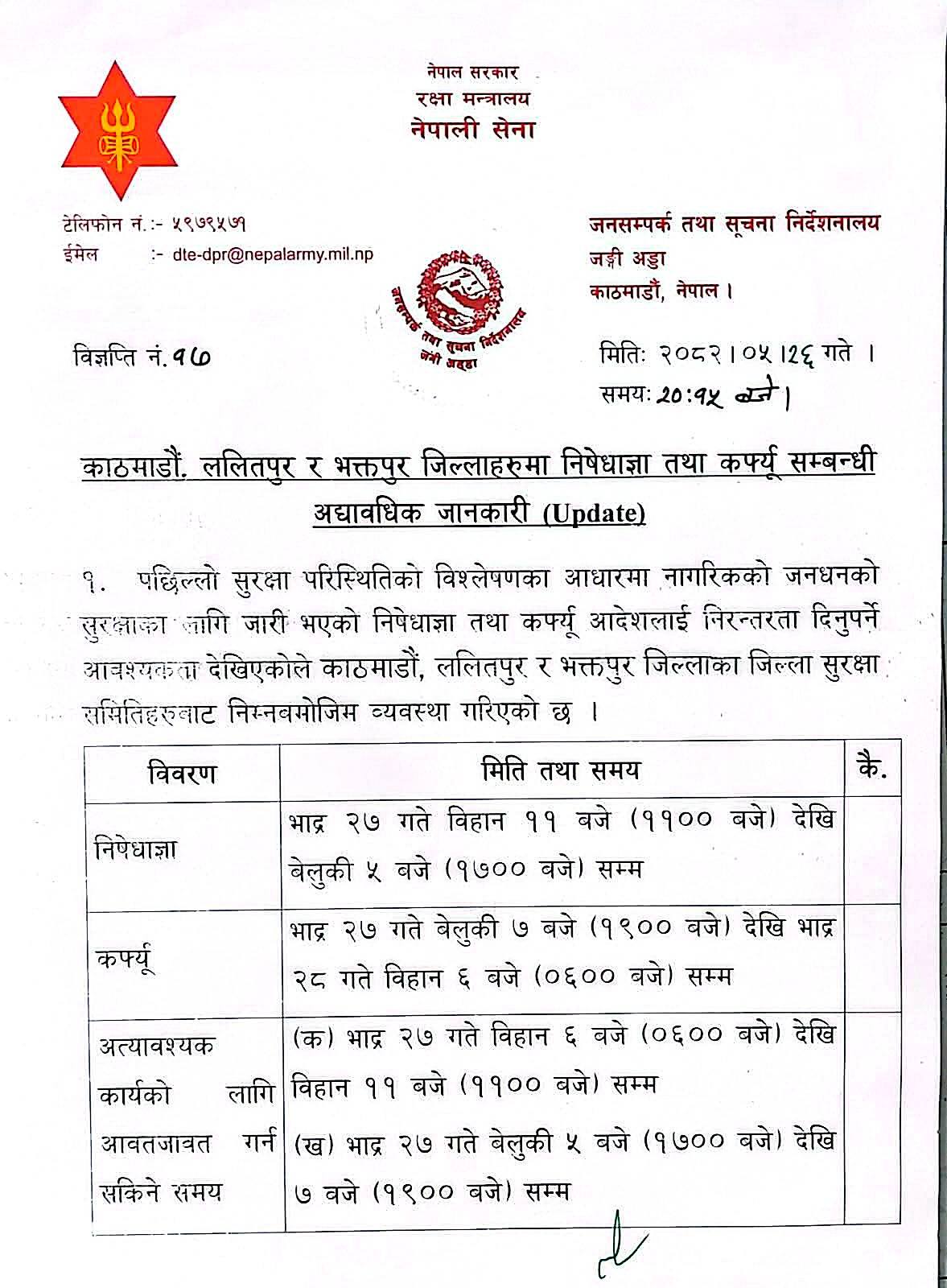 सेनाद्वारा जारी विज्ञप्तिअनुसार भोली बिहान ११ बजेसम्म खुला गरिएको छ भने त्यसपछि साँझ ५ बजेसम्म निषेधाज्ञा जारी गरेको छ ।