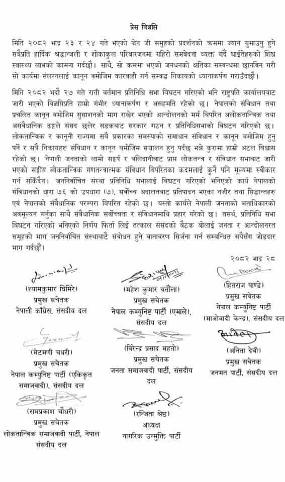 नेपाली कांग्रेस, नेकपा एमाले, नेकपा माओवादी केन्द्र, नेकपा एकीकृत समाजवादी, जनता समाजवादी पार्टी, जनमत पार्टी, लोकतान्त्रिक समाजवादी पार्टी र नागरिक उन्मुक्ति पार्टीले शनिबार संयुक्त विज्ञप्ति सार्वजनिक गर्दै संसद् विघटन जनताको मताधिकारमाथिको प्रहार भएको टिप्पणी गरेका हुन्।