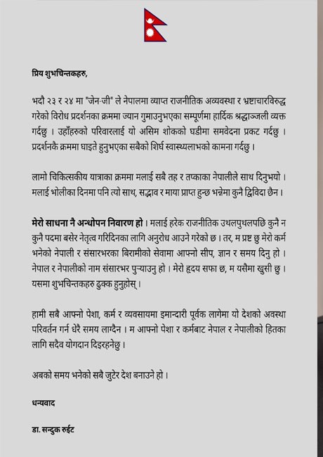 “मलाई प्रत्येक राजनीतिक उथलपुथलपछि कुनै न कुनै पदमा बसेर नेतृत्व गर्न आग्रह आउने गरेको छ,” उनले भने, “तर म स्पष्ट छु.. मेरो कर्म भनेको नेपाली र संसारभरका बिरामीलाई आफ्नो सीप, ज्ञान र समय दिएर सेवा गर्नु हो।”