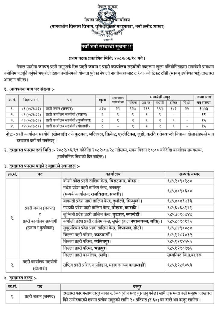 प्रहरी प्रधान कार्यालयले नेपाल प्रहरीको प्रहरी जवान, हजाम, कुचीकार र खेलाडी पदहरुमा झण्डै १६०० जनाका लागि दरखास्त आह्वान गरेको हो ।