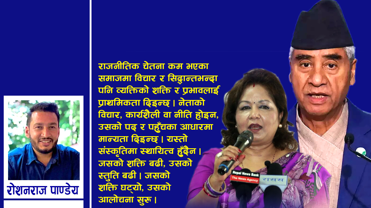 राजनीतिक संस्कृतिको कमजोरी पनि यस प्रवृत्तिको कारण हो। राजनीतिक चेतना कम भएका समाजमा विचार र सिद्धान्तभन्दा पनि व्यक्तिको शक्ति र प्रभावलाई प्राथमिकता दिइन्छ। नेताको विचार, कार्यशैली वा नीति होइन, उसको पद र पहुँचका आधारमा मान्यता दिइन्छ। यस्तो संस्कृतिमा स्थायित्व हुँदैन। जसको शक्ति बढी, उसको स्तुति बढी। जसको शक्ति घट्यो, उसको आलोचना सुरु।