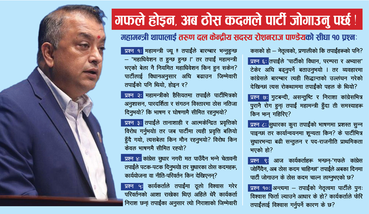 कांग्रेस भातृ संगठन नेपाल तरुण दलका केन्द्रीय सदस्य रोशनराज पाण्डेयले महामन्त्री थापालाई विभिन्न प्रश्न सोध्दै पार्टीको महाधिवेशन, पार्टीमा सुधार, कार्यकर्ताहरुको निराशालाई सम्बोधन गर्न, विधानअनुसारका कार्य र कार्यान्वयन पक्षको शुन्यताका साथै पार्टीले जनतासँग पुनः विश्वास ल्याउने आधार मागसहित १० प्रश्न गरेका छन् ।