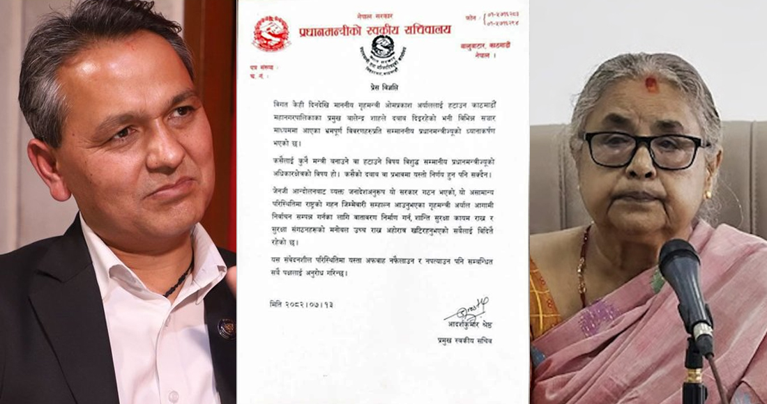 प्रमुख स्वकीय सचिव आदर्शकुमार श्रेष्ठले बिहीबार जारी गरेको विज्ञप्तिमा गृहमन्त्री अर्याललाई हटाउन काठमाडौँ महानगरपालिकाका प्रमुख बालेन्द्र शाहले दबाब दिइरहेको भनी विभिन्न सञ्चार माध्यममा आएका विवरणहरु भ्रमपूर्ण भएको भन्दै प्रधानमन्त्री सुशीला कार्कीको ध्यानाकर्षण भएको उल्लेख छ ।