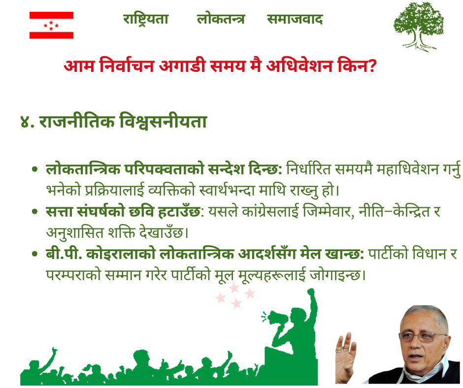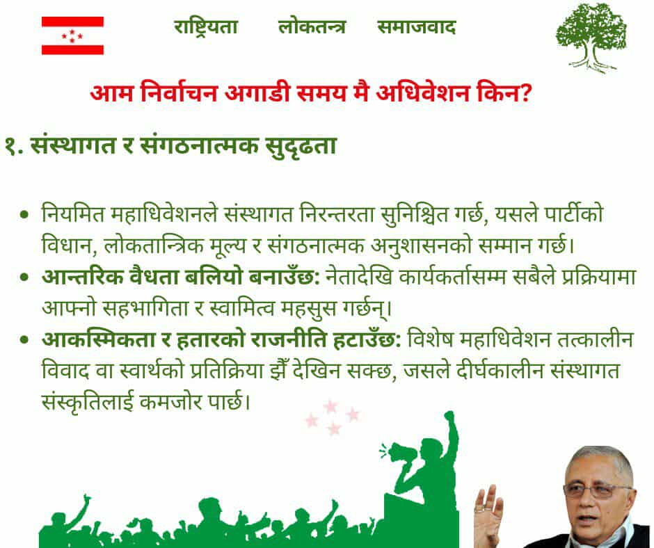 निर्धारित समयमै महाधिवेशन गर्नु भनेको प्रक्रियालाई व्यक्तिको स्वार्थभन्दा माथि राख्नु हो । यसले कांग्रेसलाई जिम्मेवार, नीति केन्द्रीत र अनुशासित शक्ति देखाउँछ । पार्टीको विधान र परम्पराको सम्मान गरेर पार्टीको मूल मूल्यहरुलाई जोगाइन्छ ।