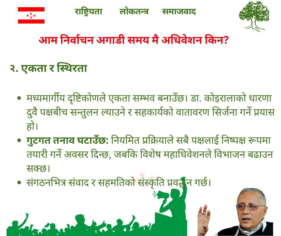 घोषित निर्वाचन अगाडि नै पार्टीको नियमित महाधिवेशन गर्नुपर्ने आवाज उठिरहेको बेलामा डा. शेखर कोइराला नेतृत्वको पक्षबाट जारी अध्ययन र छलफल अनुसार, नियमित अधिवेशनले पार्टीको लोकतान्त्रिक अभ्यासलाई बलियो बनाउँदै दीर्घकालीन स्थायित्व सुनिश्चित गर्ने निष्कर्ष निकालिएको छ।