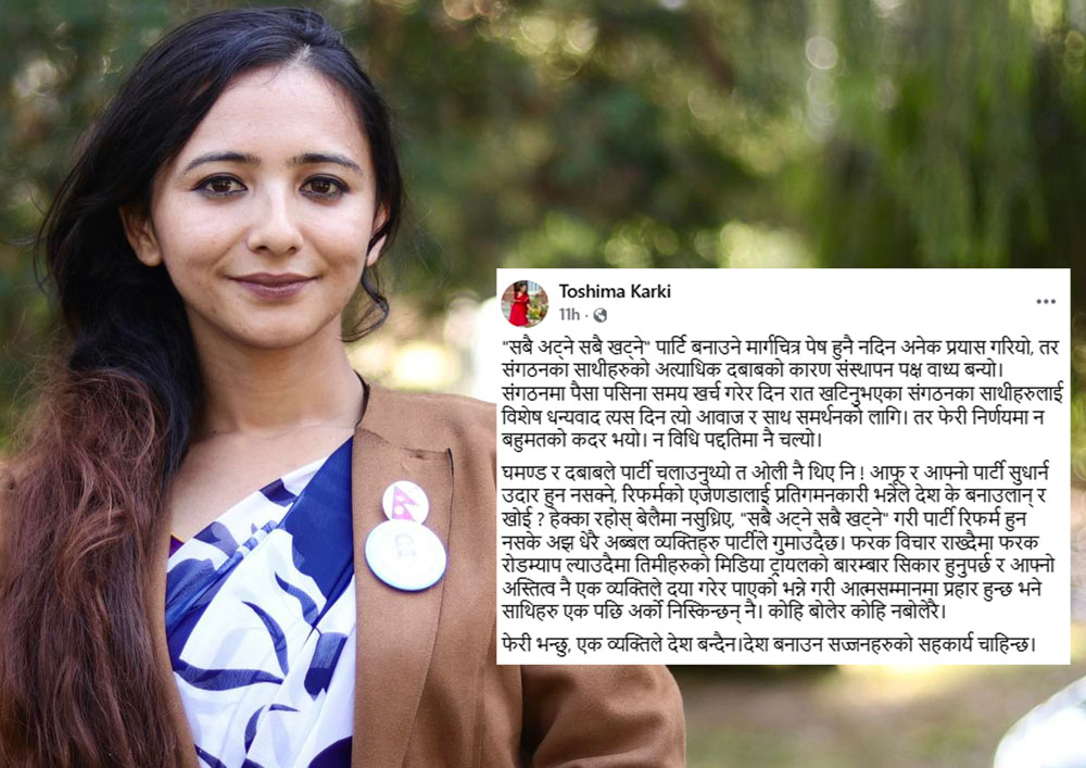 रास्वपा छाड्ने तोसिमाको संकेत, ‘सबै अट्ने गरी रिफर्म नगरे अझै अब्बल साथीहरुले पार्टी छाड्ने दिन आउँदैछ’