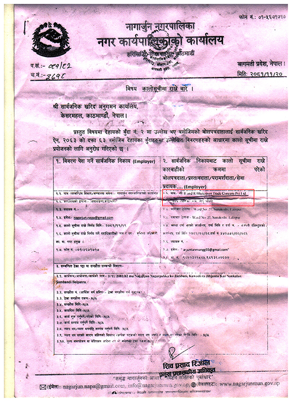 पछिल्लो समय उनीहरुको यो कम्पनी ठेक्का र टेण्डरसम्बन्धी काम गर्नका लागि कालोसूचीमा परेको जनाइएको छ । उनीहरुको उक्त कम्पनीलाई नागार्जुन नगरपालिकाले गत वर्ष नै कालोसूचीमा राख्नका लागि सिफारिस गरिसकेको छ ।
