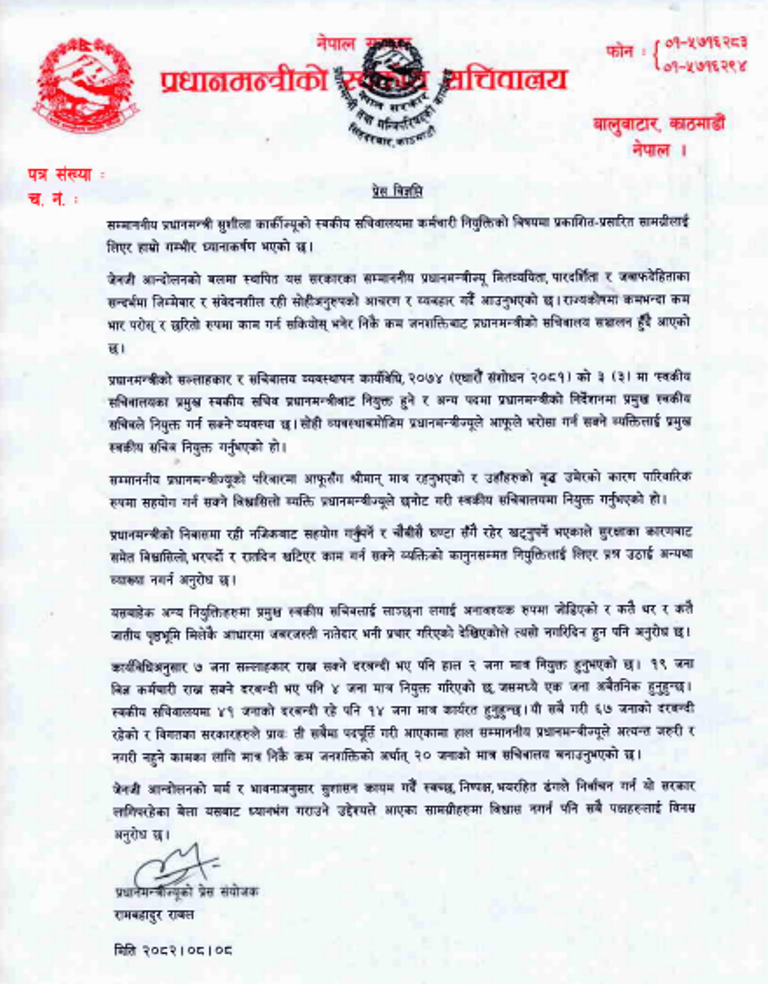 काठमाडौं – प्रधानमन्त्री सुशीला कार्कीको सचिवालयमा पारिवारिक तथा नातेदारका व्यक्तिहरूलाई नियुक्त गरेको भन्ने समाचार सार्वजनिक भएसँगै प्रधानमन्त्रीको निजी सचिवालयले उक्त विषयमा स्पष्टीकरण दिएका छ। लगातार आलोचना बढेपछि सचिवालयले विज्ञप्ति जारी गर्दै आरोपहरू असत्य, मनगढ़न्त र नियोजित रूपमा फैलाइएको जनाएको छ।
