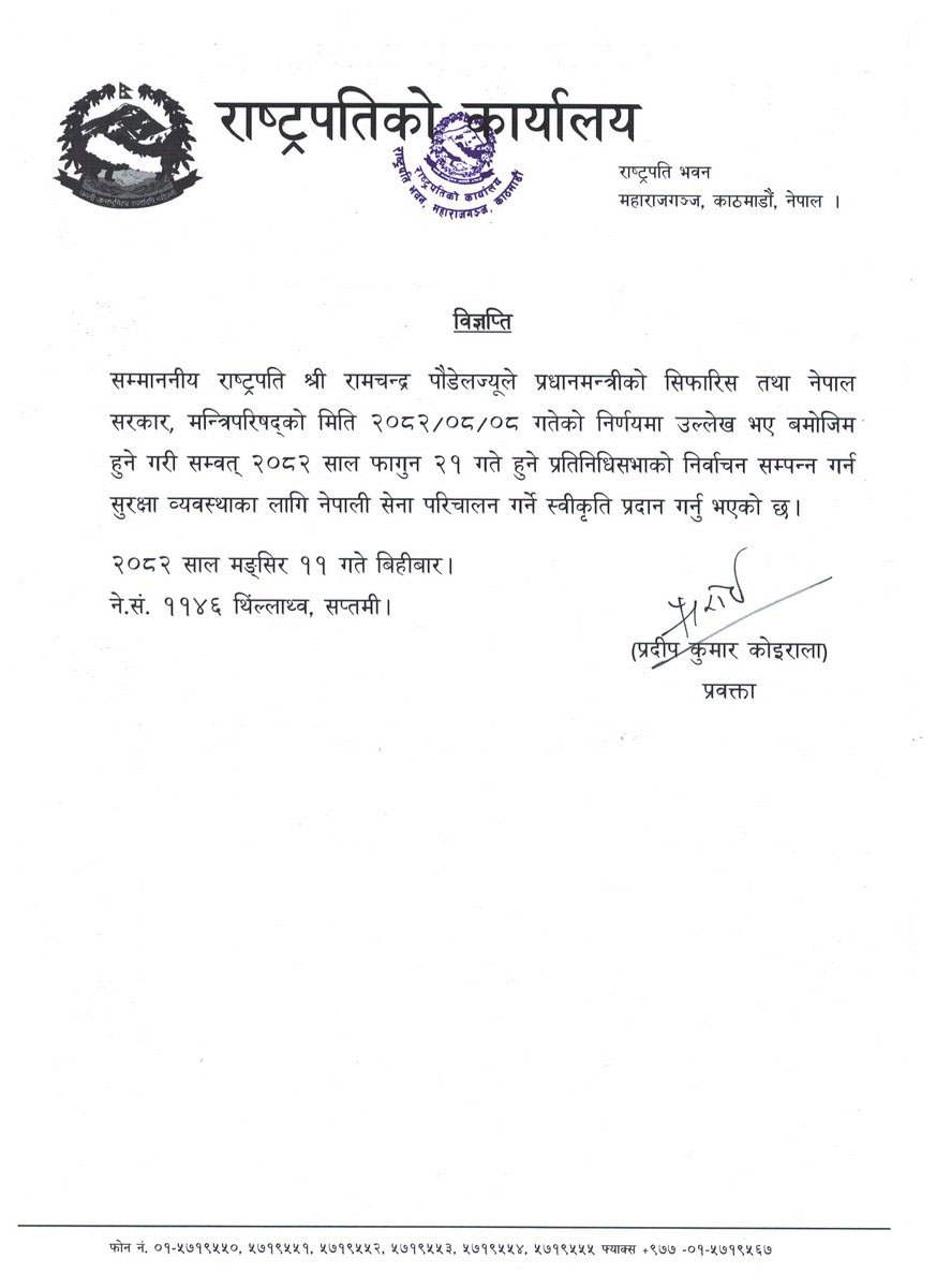 सेना परिचालनका लागि राष्ट्रपति पाैडेलले दिए स्वीकृति