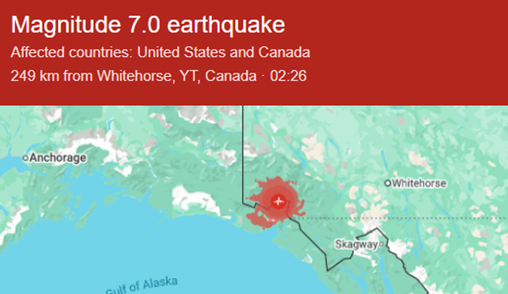 भूकम्प युकोन टेरिटोरीमा स्थानीय समय अनुसार शनिबार दिउँसो १:४१ बजे गएको हो, जसको केन्द्रबिन्दु ह्वाइटहर्सबाट करिब २५० किलोमिटर पश्चिममा थियो ।