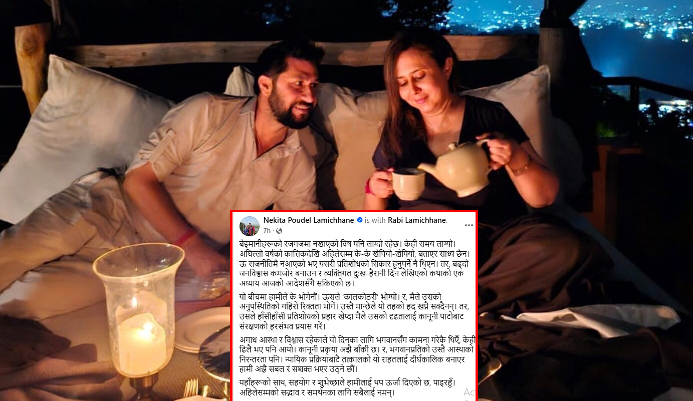 काठमाडाैं – रास्वपा सभापति रवि लामिछानेलाई बुटवल उच्च अदालतले धरौटीमा रिहा गर्ने आदेश दिएसँगै उनकी पत्नी निकिता पौडेलले मध्यरातमा सामाजिक सञ्जालमार्फत् एउटा कथाको एउटा अध्याय सकिएको जनाएकी छिन् ।