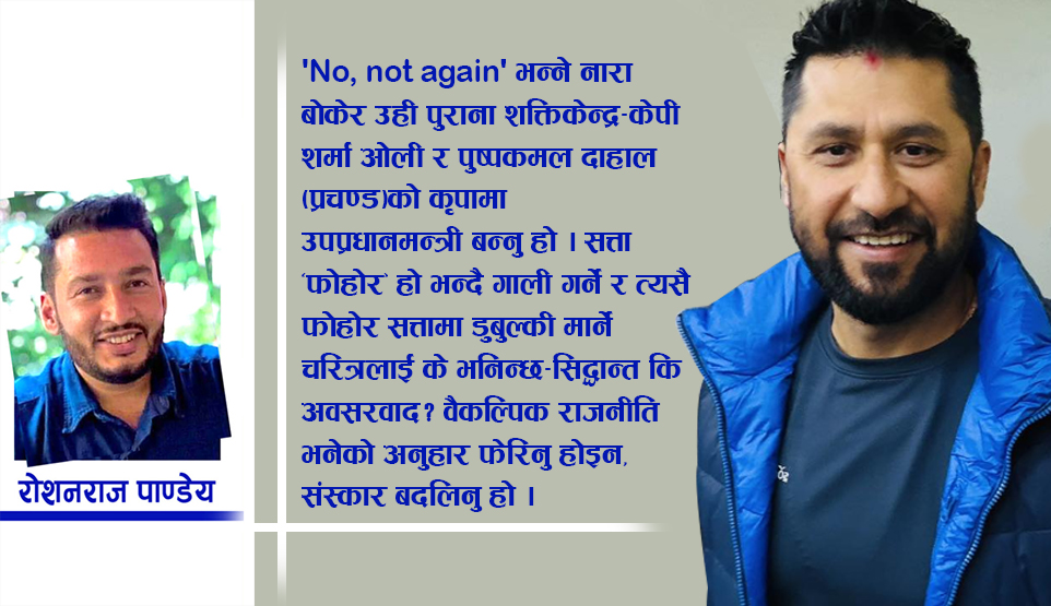 सबैभन्दा ठूलो व्यङ्ग्य भने “No, not again” भन्ने नारा बोकेर उही पुराना शक्तिकेन्द्र—केपी शर्मा ओली र पुष्पकमल दाहाल (प्रचण्ड)—को कृपामा उपप्रधानमन्त्री बन्नु हो। सत्ता ‘फोहोर’ हो भन्दै गाली गर्ने र त्यसै फोहोर सत्तामा डुबुल्की मार्ने चरित्रलाई के भनिन्छ—सिद्धान्त कि अवसरवाद? वैकल्पिक राजनीति भनेको अनुहार फेरिनु होइन, संस्कार बदलिनु हो।