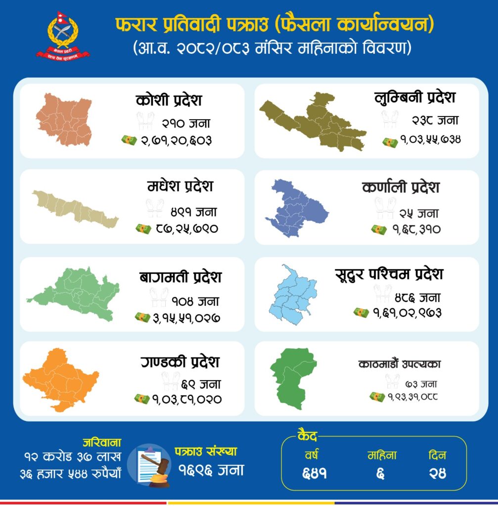 काठमाडौं – नेपाल प्रहरीले मंसिरको एक महिनामा करिब १७ सय फरार प्रतिवादीहरुलाई पक्राउ गरेको छ ।