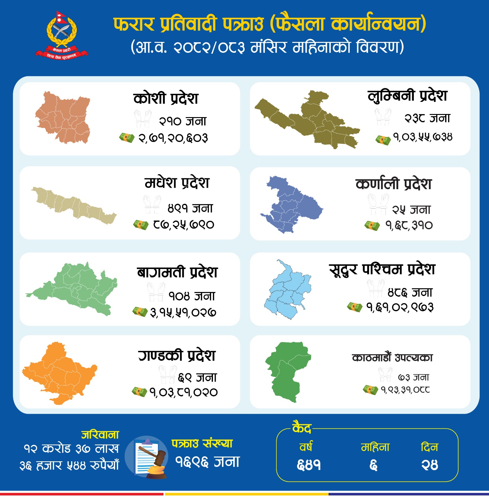प्रहरीका अनुसार ती व्यक्तिहरुबाट ६४१ वर्ष ६ महिना २४ दिन कैद भुक्तान बाँकी रहेको छ भने १२ करोड ३७ लाख २६ हजार ५ सय ४४ रुपैयाँ जरिवाना उठ्न बाँकी रहेको छ ।