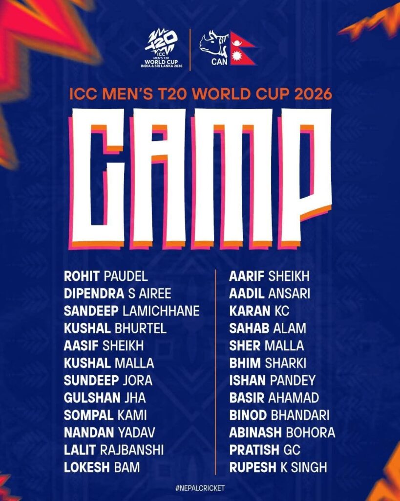 काठमाडौं- आईसीसी पुरुष टी२० विश्वकप २०२६ का लागि नेपाल क्रिकेट संघ (क्यान)ले प्रारम्भिक टोलीको घोषणा गरेको छ। प्रशिक्षण  क्याम्पका लागि २४ खेलाडी बोलाइएका हुन्  ।