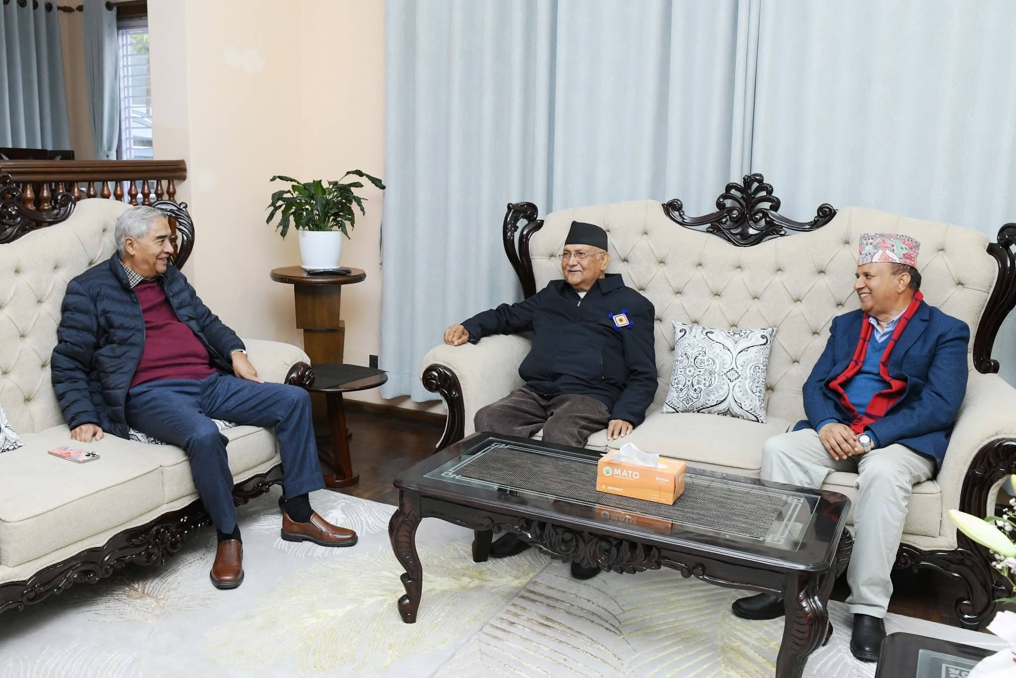 देउवालाई भेट्न ओली देउवाकै निवास महाराजगञ्ग पुगेका हुन् । ओलीको साथमा एमालेका महासचिव शंकर पोखरेल पनि रहेका थिए ।