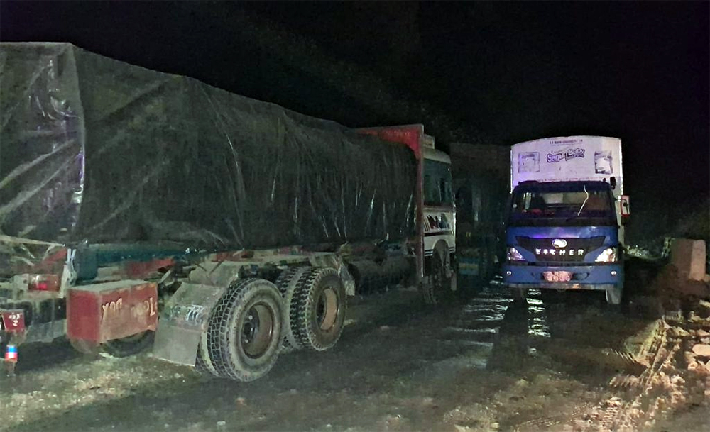 दाउन्ने खण्डको उकालो र ओरालोमा शीतलहरले बाटो भिज्दा गाडी चिप्लिएर गुड्न नसकेपछि १५ घण्टादेखि गाडी चल्न नसकेको इलाका प्रहरी कार्यालय दुम्कीबासका प्रहरी नायव निरीक्षक ज्ञानप्रसाद काफ्लेले बताए ।