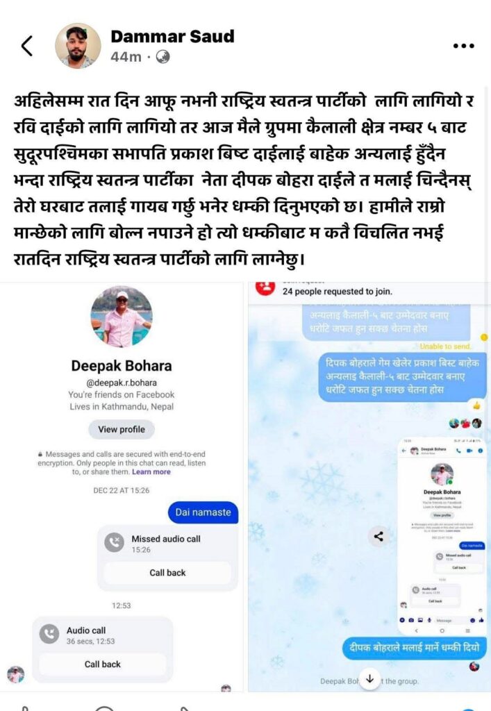 कैलालीका साउदले फेसबुक म्यासेन्जरमार्फत सार्वजनिक गरेको जानकारी अनुसार, उनले अबसम्म पार्टीका लागि रातदिन आफूलाई समर्पित गरेको भए पनि कैलाली क्षेत्र नम्बर ५ बाट सुदूरपश्चिमका सभापति प्रकाश बिष्ट बाहेक अन्यलाई नमान्ने भन्दा बोहराले उनलाई फेसबुक म्यासेन्जर कलमा ‘तेरो घरबाट तलाई गायब गर्छु’ भनेर धम्की दिएका थिए।