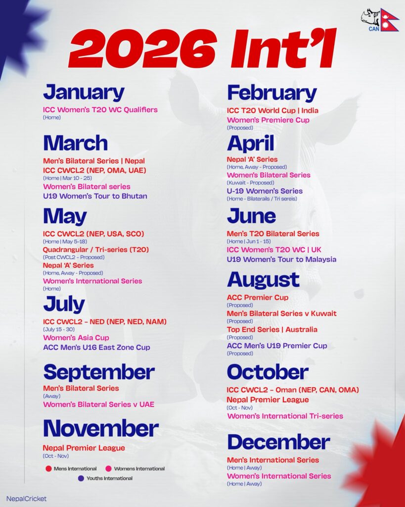 काठमाडौं – नेपाल क्रिकेट संघ (क्यान)ले सन् २०२६ का लागि वार्षिक क्रिकेट क्यालेन्डर सार्वजनिक गरेको छ। सार्वजनिक क्यालेन्डरअनुसार वर्षभर घरेलु तथा अन्तर्राष्ट्रिय प्रतियोगिताहरू सञ्चालन हुनेछन्।