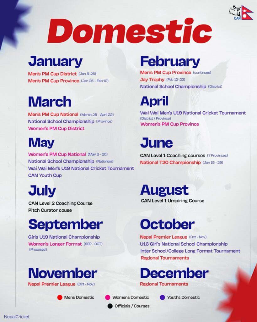 क्यालेन्डरमा २८ वटा घरेलु प्रतियोगिता समावेश गरिएका छन् भने ३२ वटा अन्तर्राष्ट्रिय प्रतियोगितामा नेपाली पुरुष तथा महिला टोलीको सहभागिता रहनेछ। सन् २०२६ नेपाल क्रिकेटका लागि महत्वपूर्ण रहने क्यानले जनाएको छ।