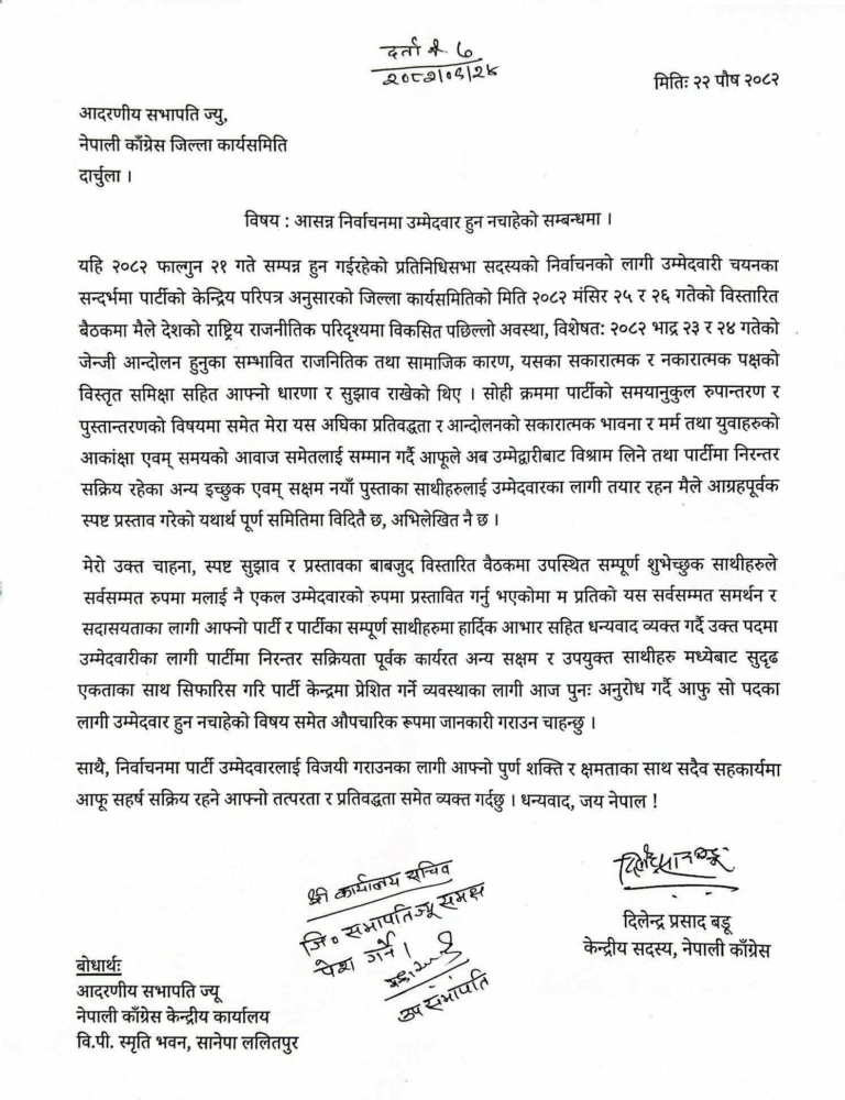 उनले पार्टीको उम्मेदवार जिताउन लाग्ने प्रतिबद्धता जनाएका छन् । बडूलाई दार्चुलाबाट कांग्रेसले उम्मेदवारको लागि एकल नाम सिफारिस गरेको थियो । तर, उनले भने चुनावमा उम्मेदवार नै नबन्ने निर्णय गरेका हुन् ।
