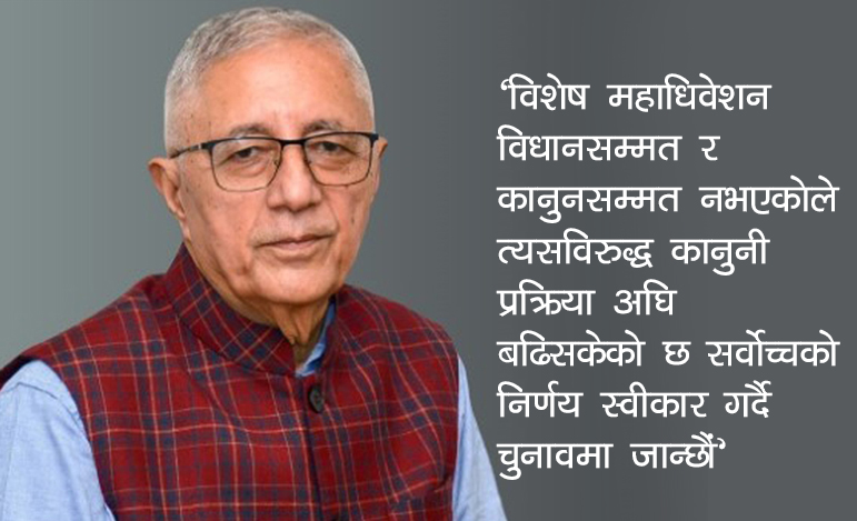 पहिलो, उनले प्रस्तावित विशेष महाधिवेशन विधानसम्मत र कानुनसम्मत नभएको बताउँदै त्यसको विरुद्धमा कानुनी प्रक्रिया अघि बढाइसकेको जानकारी दिए । यसैक्रममा निर्वाचन आयोगले गरेको निर्णयको विरोधमा अदालतमा मुद्दा दर्ता भइसकेको र यो विषय अहिले सर्वोच्च अदालतको विचाराधीन रहेको पनि उनले उल्लेख गरे ।