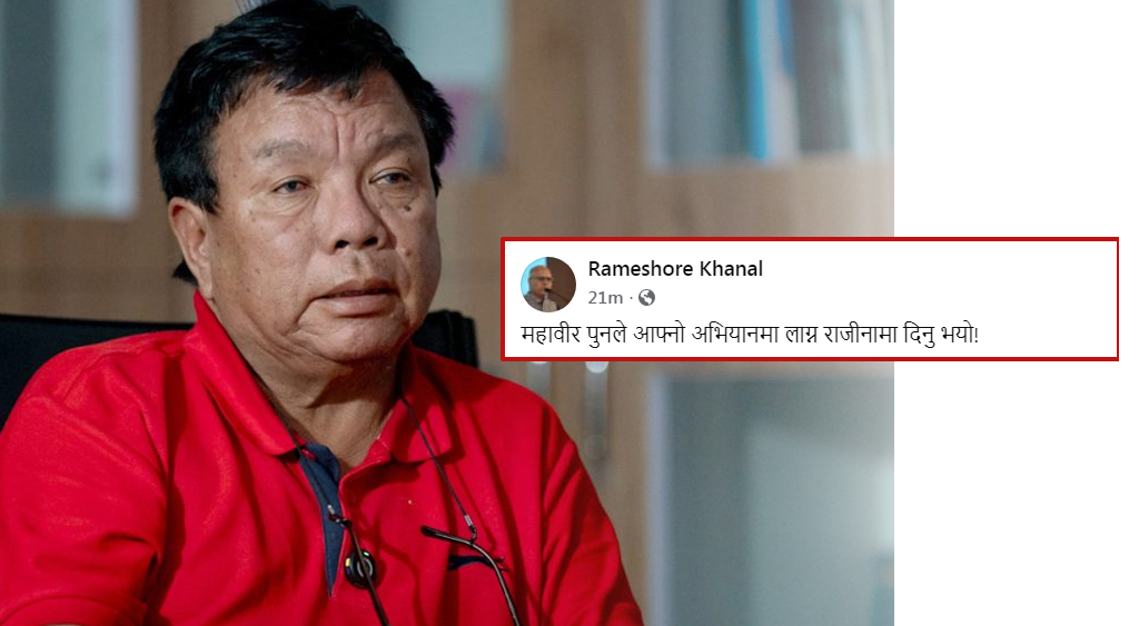 उनले फेसबुकमा लेखेका छन्, ‘महाविर पुनले आफ्नो अभियानमा लाग्न राजीनामा दिनुभयो ।’