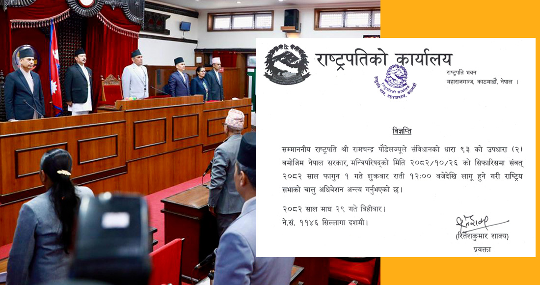 नेपाल सरकार, मन्त्रिपरिषद्को सिफारिसमा २०८२ साल फागुन १ गते शुक्रबार राति १२ः०० बजेदेखि लागू हुने गरी राष्ट्रिय सभाको चालु अधिवेशन अन्त्य गरिएको हो ।
