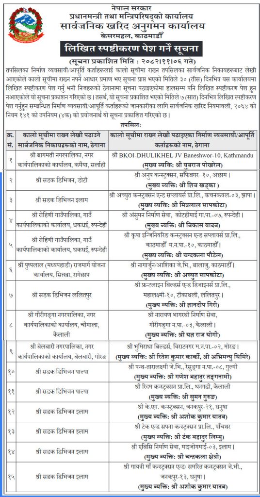 विभिन्न सरकारी निकायहरुले निर्माण तथा आपूर्तिका लागि जिम्मा पाएका कम्पनीहरुले निर्धारित समयमा काम नगरेको भन्दै कालोसूचीमा राख्नका लागि सिफारिस गरे बमोजिम कार्यालयले उनीहरुलाई ७ दिन भित्र स्पष्टीकरण राख्न सूचना जारी गरेको हो ।