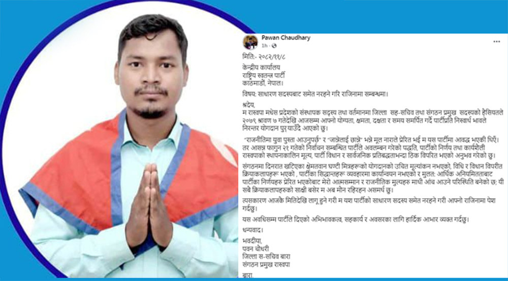 सहसचिव पवन चौधरी पार्टी कार्यालयमा राजीनामा पत्र पठाउँदै भनेका छन्, “राजनीतिमा युवा पुस्ता आउनुपर्छ” र “जान्नेलाई छान्ने” भन्ने मूल नाराले प्रेरित भई म यस पार्टीमा आवद्ध भएको थिएँ। तर आसन्न फागुन २१ गतेको निर्वाचन सम्बन्धित पार्टीले अवलम्बन गरेको पद्धति, पार्टीको निर्णय तथा कार्यशैली रास्वपाको स्थापनाकालिन मूल्य, पार्टी विधान र सार्वजनिक प्रतिबद्धताभन्दा ठिक विपरित भएको अनुभव गरेको छु।’