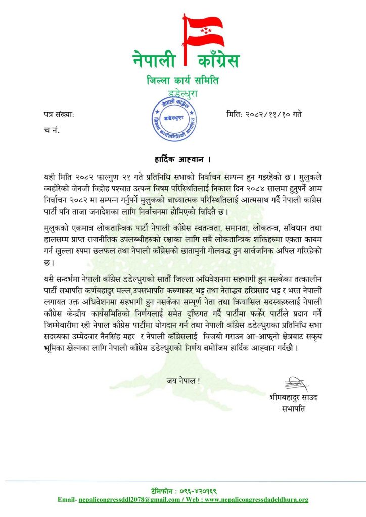 यसै सन्दर्भमा डडेल्धुराको सातौं जिल्ला अधिवेशनमा सहभागी हुन नसकेका तत्कालीन पार्टी सभापति कर्णबहादुर मल्ल, उपसभापति करुणाकर भट्ट, नेता हरिप्रसाद भट्ट र भरत नेपाली लगायत सबै नेता तथा क्रियाशील सदस्यलाई नेपाली कांग्रेसमा फर्किएर सक्रिय योगदान दिन आग्रह गरिएको छ। जिल्ला सभापति भीमबहादुर साउदले एक विज्ञप्ति जारी गर्दै प्रतिनिधि सभा सदस्यका उम्मेदवार नैनसिंह महर र नेपाली कांग्रेसलाई विजयी गराउन ती सबै नेतालाई सक्रिय भूमिका खेल्न आग्रह गरेका छन्।