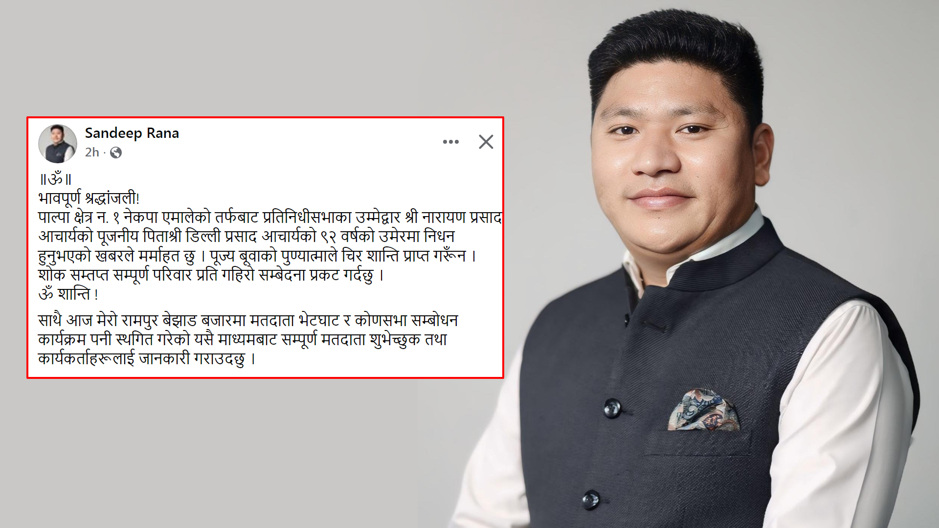 पाल्पा क्षेत्र नं. १ बाट उम्मेदवारी दिएका रानाले प्रतिस्पर्धी उम्मेदवारका पिताको निधन भएपछि श्रद्धाञ्जली अर्पण गर्दै आप्mनो आजको चुनावी कार्यक्रम स्थगित गरेको घोषणा गरेका छन् ।