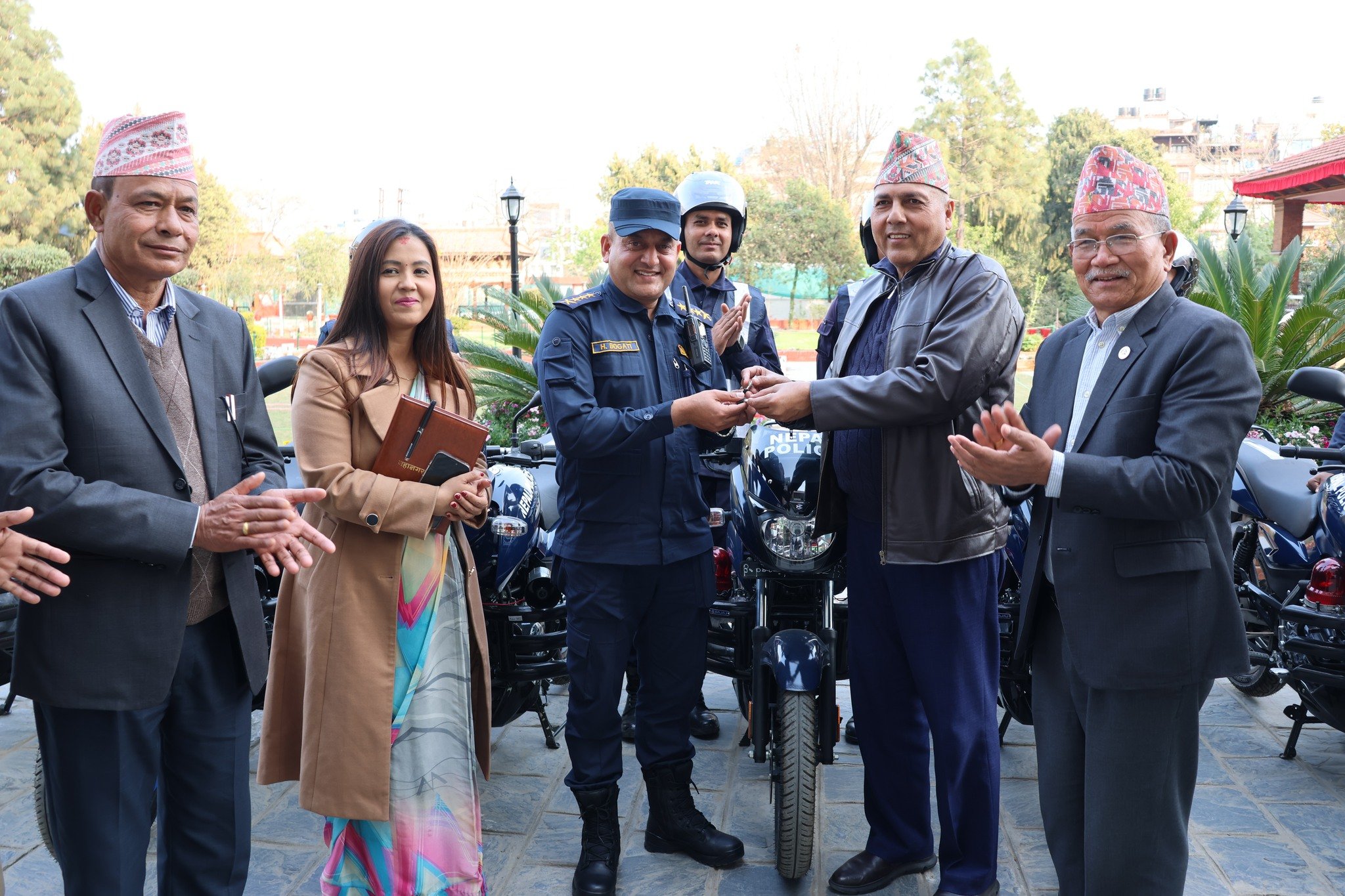 ललितपुर महानगरद्वारा प्रहरीलाई ८ थान मोटरसाइकल प्रदान, मेयर चिरीबाबुले गरे हस्तान्तरण